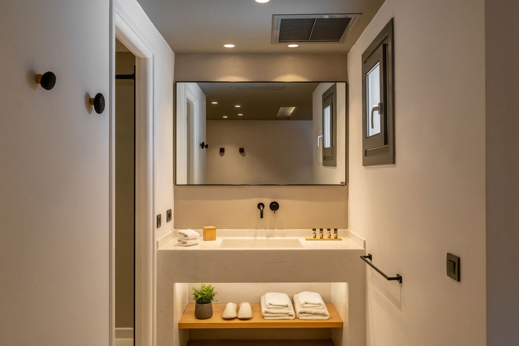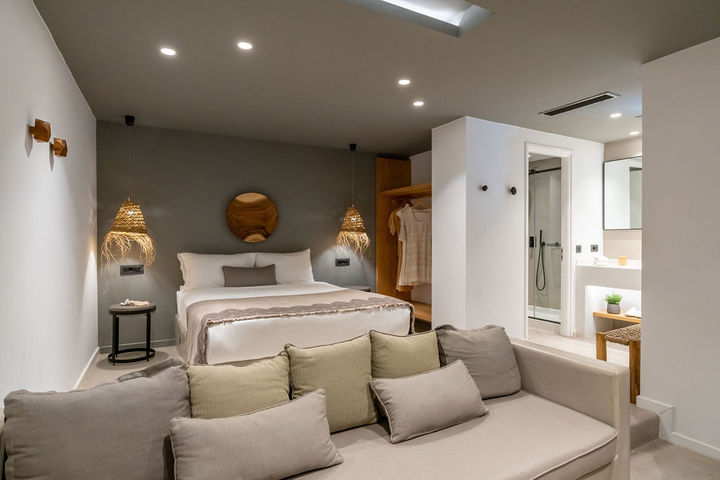 Δίκλινο δωμάτιο 28 m², στο ισόγειο με Queen size κρεβάτι, καναπέ, ολόσωμο καθρέπτη, smart TV, Nespresso καφετιέρα, βραστήρα, σεσουάρ, παντόφλες και μπάνιο με στήλη ντους.