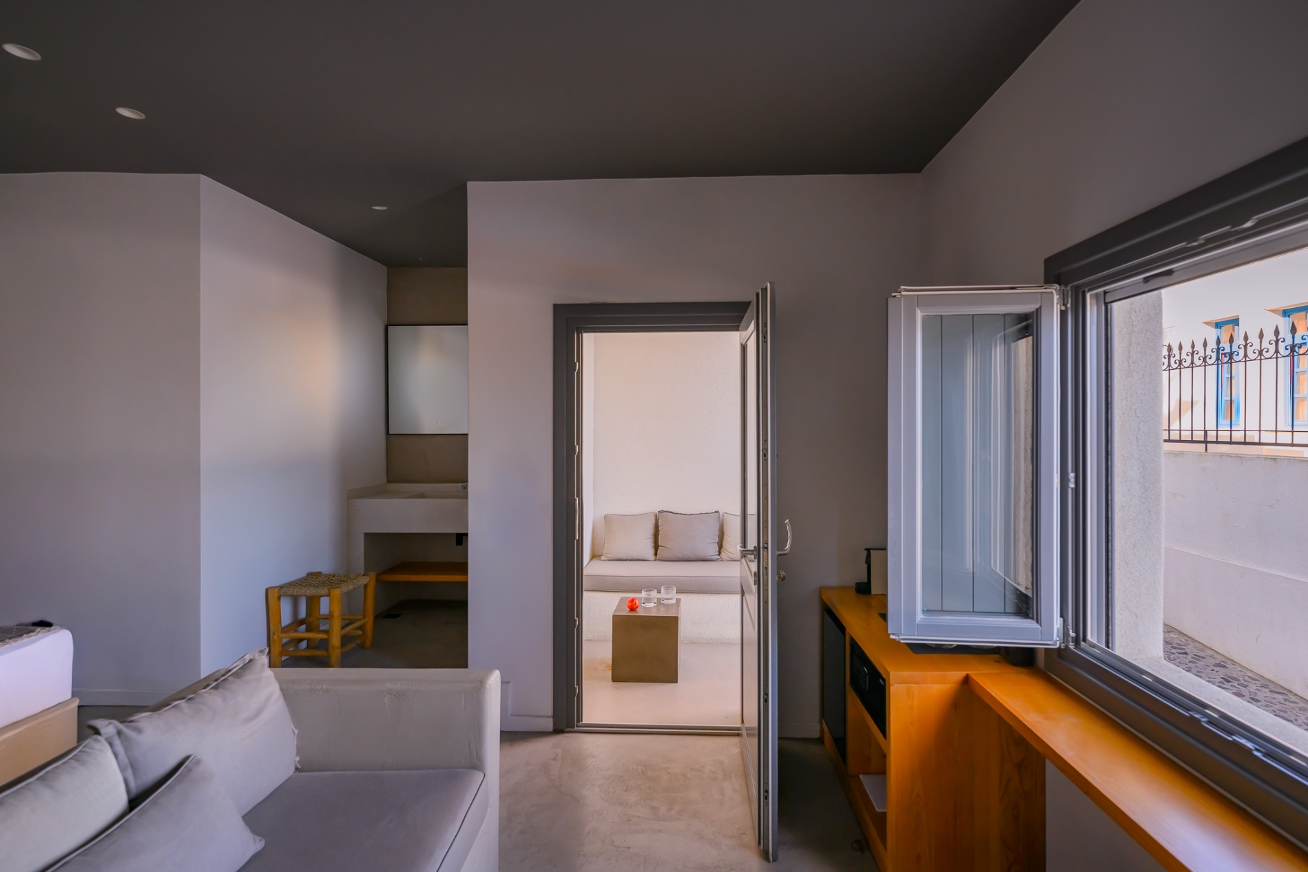 Δίκλινο δωμάτιο 28 m², στο ισόγειο με πλάγια θέα στη θάλασσα, Queen size κρεβάτι, καναπέ, ολόσωμο καθρέπτη, smart TV, Nespresso καφετιέρα, βραστήρα, σεσουάρ, παντόφλες και μπάνιο με στήλη ντους.