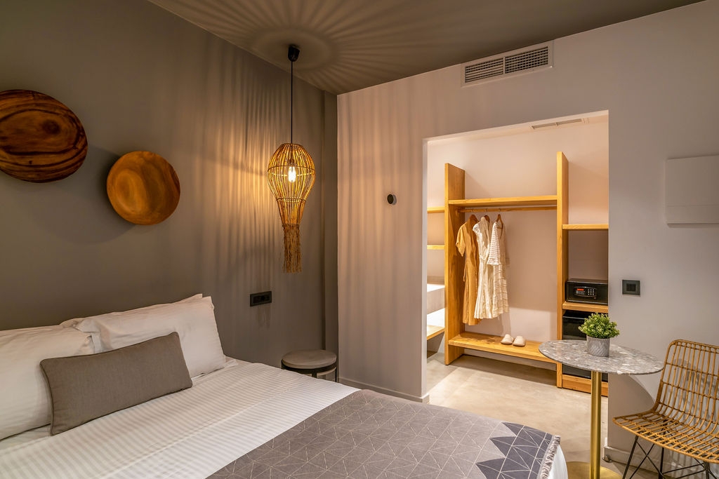 Δίκλινο δωμάτιο 20 m² στο ισόγειο, με Queen size κρεβάτι, ολόσωμο καθρέπτη, smart TV, μηχανή καφέ Nespresso, βραστήρα, σεσουάρ, παντόφλες και πλήρες μπάνιο με στήλη ντους.