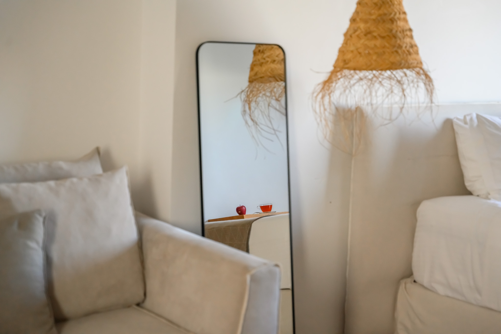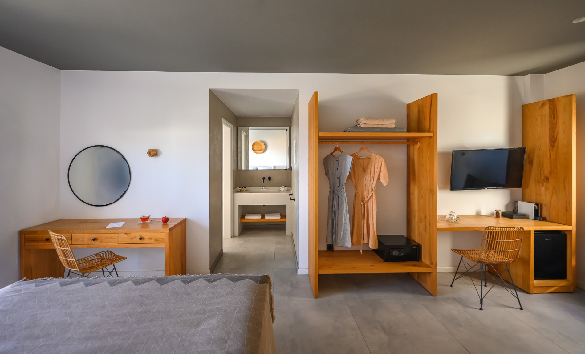 Σουίτα 36 m² στον όροφο με εξωτερικό ιδιωτικό jacuzzi στο μπαλκόνι, King size κρεβάτι, καναπέ, ολόσωμο καθρέπτη, smart TV, Nespresso καφετιέρα, βραστήρα, σεσουάρ, παντόφλες και μπάνιο με στήλη ντους.