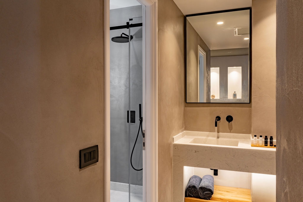 Σουίτα 34 m² στον όροφο με εξωτερικό ιδιωτικό jacuzzi στο μπαλκόνι, King size κρεβάτι, καναπέ, ολόσωμο καθρέπτη, smart TV, Nespresso καφετιέρα, βραστήρα, σεσουάρ, παντόφλες και μπάνιο με στήλη ντους.